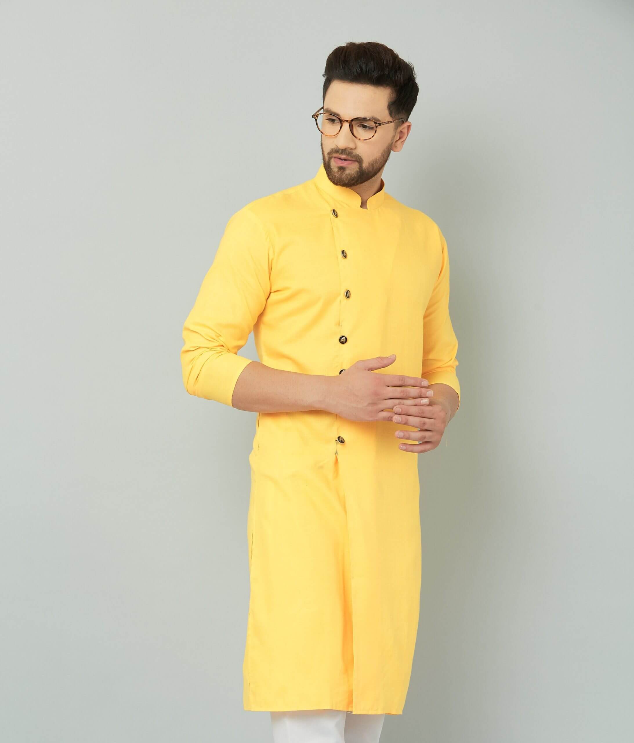 Traditional Indian yellow cotton kurta.Stylish Assymetric Sherwani Style Kurta-Mustard